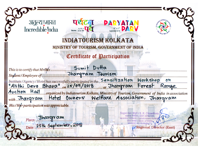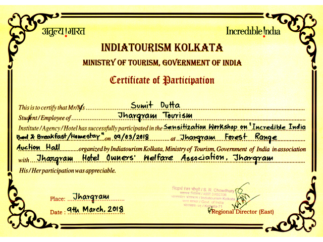 A Sensitization Workshop on "Incredible India Bed & Breakfast/Homestay" was organized by Ministry of Tourism, Govt. of India at Jhargram on 8th and 9th March, 2018. The basic idea is to provide a clean and affordable place for foreign tourists and domestic tourists to stay with an Indian family to experience Indian customs, traditions and relish authentic indian cuisine.