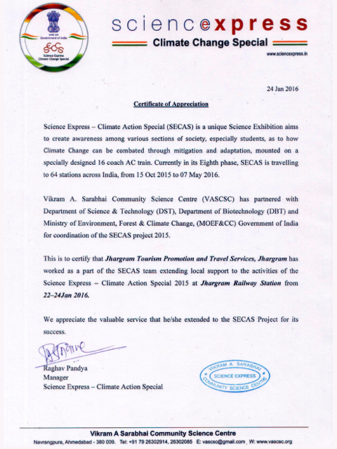 "Science Express - Climate Action Special (SECAS)" is a unique Science Exhibition focusing on how climate change can be combated through mitigation and adaptation, mounted on a specially designed 16 coach AC train, which has been exhibited at Jhargram Railway Station on 22nd to 24th January, 2016. We informed many schools, provided acommodation and 13 guides for their local support.